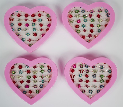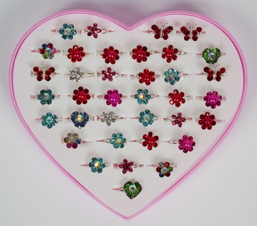 Zestaw 36 pierścionków dla dziewczynki. Każde opakowanie zawiera mix 36 pierścionków o losowych kształtach i kolorach. Pierścionki pięknie się błyszczą wykonane z metalu. Rozmiar uniwersalny, średnica oczka 11 milimetrów z lekką regulacją.