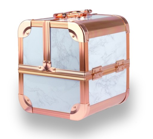 Solidny i designerski kuferek z marmurkowym motywem i kolorze Rose Gold. Niezwykłe połączenie stylu i jakości wykonania. Idealny do przechowywania kosmetyków, hybryd lub biżuterii. Idealny na prezent. Wyposażony w składane lusterko.