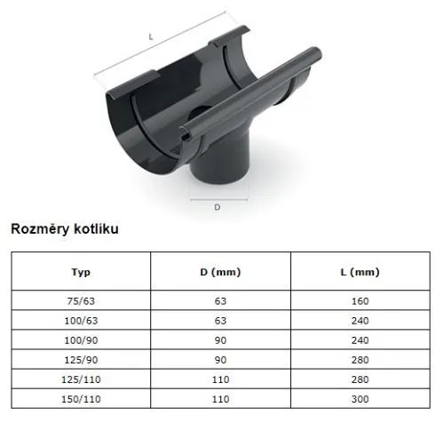 Rynna 125 mm z rurą spustową 90 mm lub 110 mm Domy jedno i wielorodzinne, bloki mieszkalne, magazyny, obiekty użyteczności publicznej, obiekty handlowe i przemysłowe