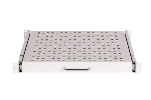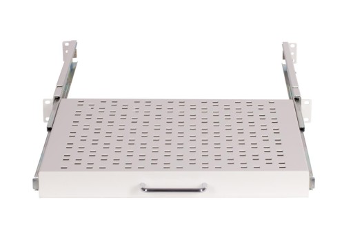 Półka 1U wykonana w standardzie rack 19" -mocowanie 4-punktowe, o głębokości 400 mm, regulowana głębokość montażowa o dodatkowe 200 mm (maksymalny rozstaw belek rack 450 mm), nośność 50 kg. Półka wyposażona w solidne prowadnice, które pozwalają na stabilne wysunięcie półki nawet z dużym obciążeniem. Uniwersalna półka do szaf rack jest kompatybilna ze wszystkimi szafami sterowniczymi w standardzie 19 cali dowolnego producenta na rynku.
