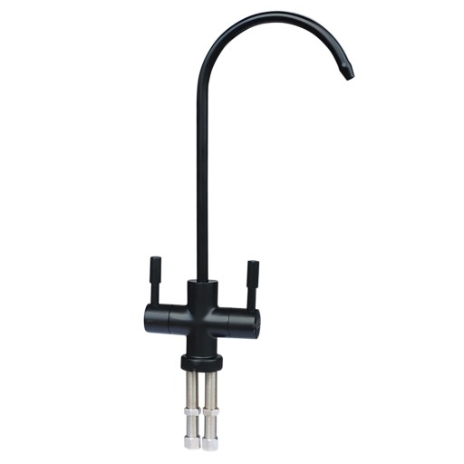 Podwójna, nowoczesna wylewka z zaworami ceramicznymi do poboru wody filtrowanej oraz zmineralizowanej. Przeznaczona do systemów Odwróconej Osmozy wyposażonych we wkład mineralizujący. Wylewkę montuje się do podstawy blatu kuchennego lub zlewozmywaka. Pasuje do większości filtrów dostępnych na rynku.
