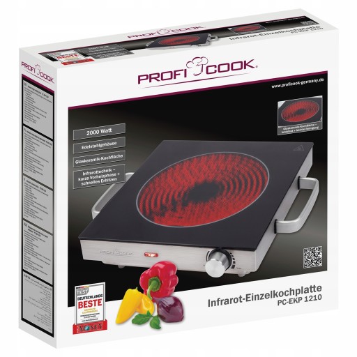 Ciesz się szybko przygotowanymi smakołykami – szybko podgrzej potrawy – oszczędzaj czas i wysiłek. Dzięki PC-EKP 1210 firmy ProfiCook otrzymujesz moc 2000 W (maks.) Pojedyncza płyta grzewcza na podczerwień z wysokiej jakości płytą ceramiczną o nowoczesnym wzornictwie.