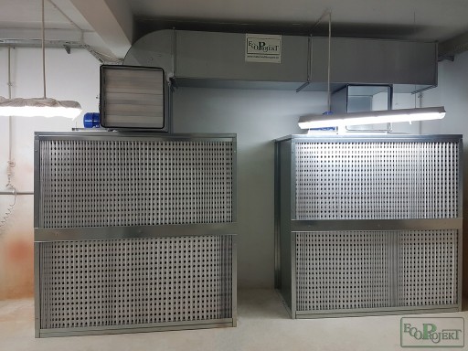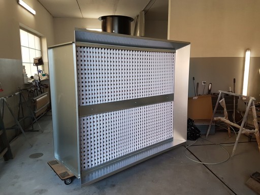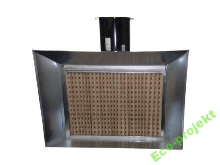 Powietrze wyciągane przez turbinę wentylatora zabiera ze sobą cząstki lotne powstałe podczas natrysku, a następnie przechodząc przez zamontowany w ścianie frontowej filtr labiryntowy typu ,,Glass Panel’’ osadza je w strukturze filtra. Oczyszczone w ten sposób powietrze jest kierowane do otworu wylotowego z urządzenia, a następnie na zewnątrz pomieszczenia.