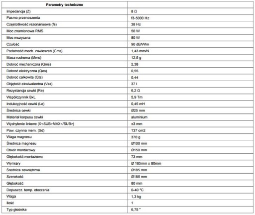 Głośnik nisko-średniotonowy HiFi, 50WRMS, 8Ω
