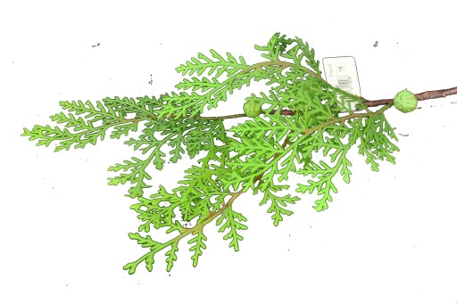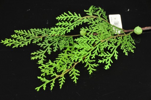Sztuczna gałązka zielonego cyprysa z szyszkami.