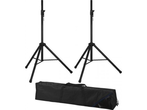 Zestaw statywów głośnikowych Składa się z dwóch aluminiowych statywów PAST-164/SW i nylonowej torby na statywy. Specyfikacja PAST-164/SW: wersja z lekkiego aluminium, lakierowanego na czarno, regulowana wysokość 140-200cm, blokada skoblem w 6 pozycjach, max obciążenie w punkcie centralnym: 30kg, waga 1.6kg.