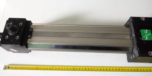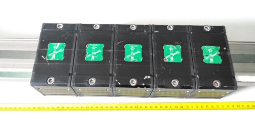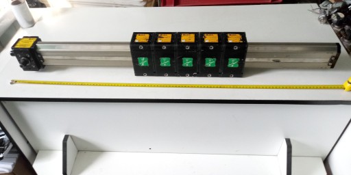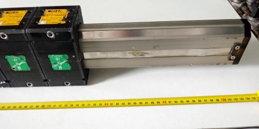Pozycjoner liniowy marki Betti, składający się z pięciu przesuwnych aluminiowych bloków napędzanych wałkiem (dowolnym z trzech widocznych wałków), w pełni sprawny, nieco poobijany - wszystkie płaszczyzny sfotografowane