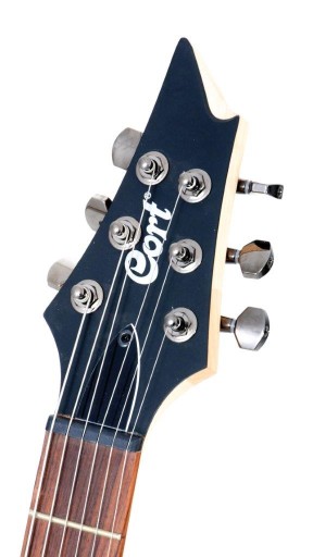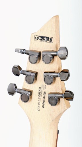 Cort KX300 Etched to również 24 progi, markery 'Raindrop', mostek Hardtail String-Thru Body oraz klucze Die-Cast.