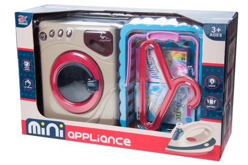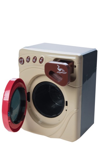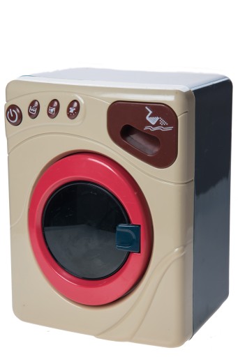Taką zabawką jest pralka do prania z koszem na pranie i wieszakami. Pralka wydaje dźwięki i świeci jak prawdziwa pralka.