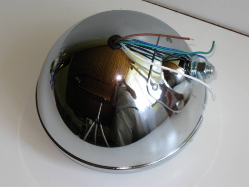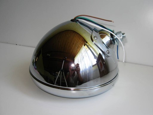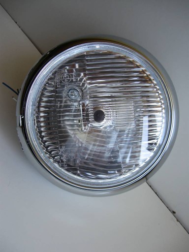 - Chromowana lampa przednia z mocowaniem dolnym w obudowie metalowej.