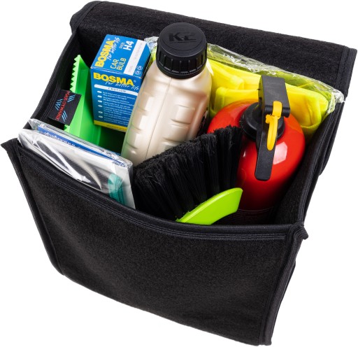 - Poręczny kształt umożliwia przechowanie pięciolitrowego pojemnika z olejem silnikowym lub płynem do spryskiwaczy lub gaśnicy kilogramowej oraz innych potrzebnych w samochodzie narzędzi, kompletu żarówek, akcesoriów itp.
