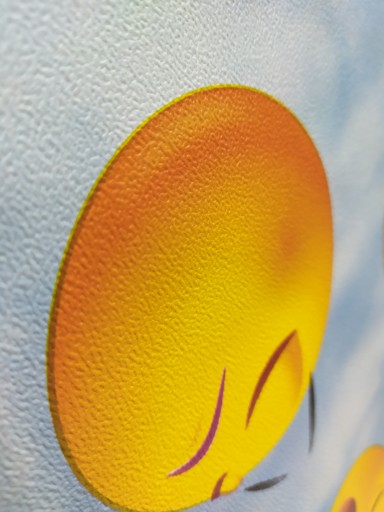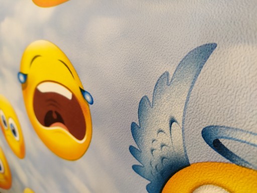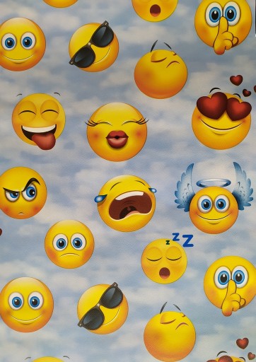 Tapeta dziecięca, młodzieżowa. Emotikony-buźki-anioł, śpioch, ślicznotka, ważniak, smutny, wesoły, płaczek, zakochany i inne. Buźki żółto-żółte, cieniowane pomarańczowym brązem. Tło - błękitne obłoki.