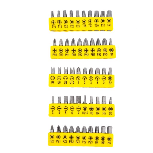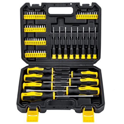 Komplet zawiera 65 wysokiej jakości elementów. Grot każdego wkrętaka wykonany z bardzo wytrzymałej stali S2, zapewniającej długą żywotność.