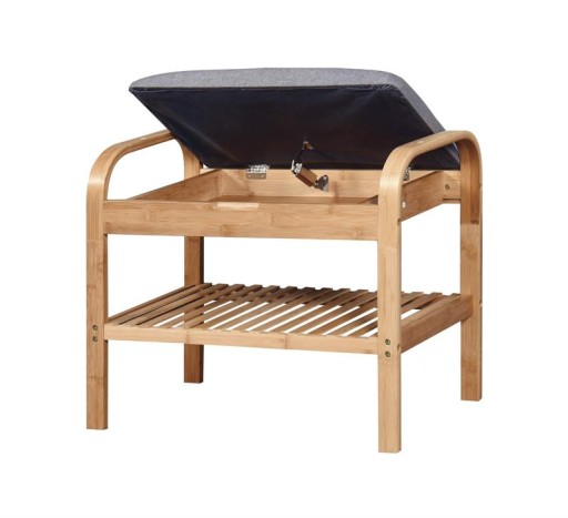 Klasyczny stojak na buty ST12 o minimalistycznej formie idealnie dopasuje się do wnętrz w stylu scandynawskim, ale i do bardziej klasycznych form. Wykonany został z drewna litego bambusowego, zapewniając wytrzymałość i stabilność, a tym samym jest gwarancją długoletniej użyteczności mebla. Wyposażony jest w przestronną półkę, pozwalające na komfortowe uporządkowanie obuwia. Ogromną zaletą tego produktu jest wygodne, otwierane siedzisko wykonane z tkaniny materiałowej w kolorze szarym, we wnętrzu którego możesz poręcznie przechowywać różne akcesoria garderobiane.