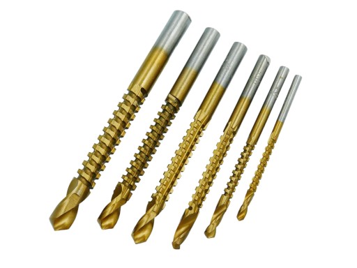 Zestaw 6-ciu wierteł frezujących ze stali HSS ze szczególnie wydajną spiralą frezującą, powlekane warstwą azotku tytanu.