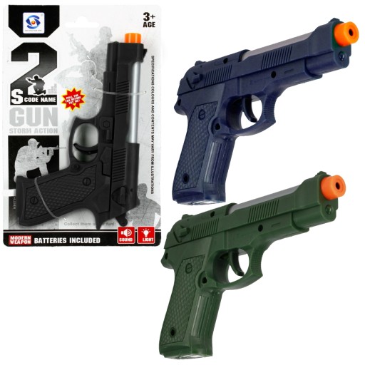 Pistolet po naciśnięciu na spust wydaje odgłosy strzelania, a lufa świeci się na czerwono.