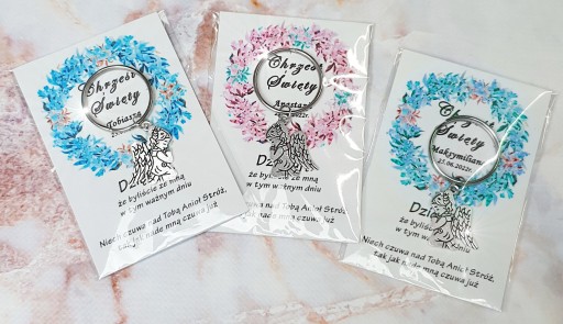 Podziękowanie dla gości w postaci breloczka z aniołkiem oraz spersonalizowanej karteczki + celofan do zapakowania.