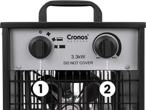 Termowentylator CRONOS® bardzo wydajnie rozprowadza ciepło po pomieszczeniu. Skutecznie nagrzeje powierzchnię o wielkości do 25m2. Urządzenie jest wyposażone w termostat samosterujący. Wyczuwa on temperaturę powietrza i kontroluje temperaturę w pomieszczeniu. Termostat wyłączy urządzenie w razie ryzyka przegrzania.