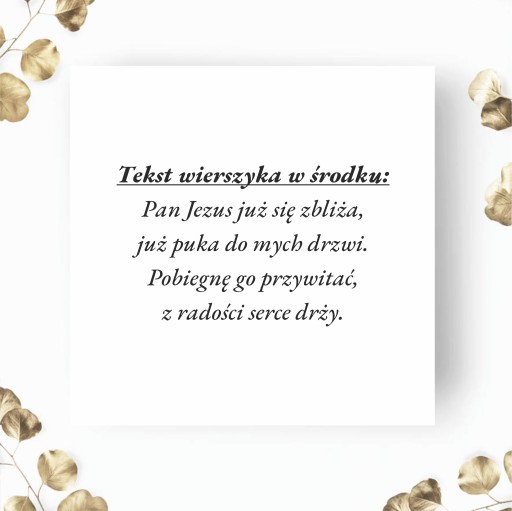 (Prosimy aby podawać gotowe informacje do wpisania. Prosimy aby wiadomość wyglądała mniej więcej w ten sposób: "Przód: Komunia Mateusza, w środku: Mateusz..." proszę wpisywać według własnego uznania tak jak ma się znaleźć na zaproszeniach. Edycji podlega jedynie imię dziecka pozostały tekst jest nieedytowalny.)