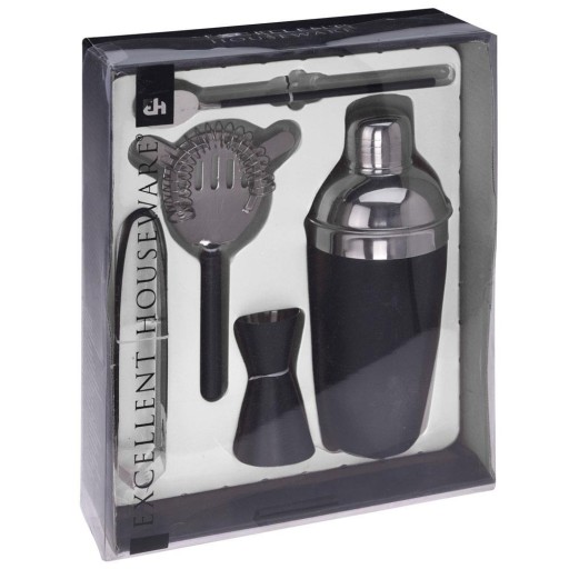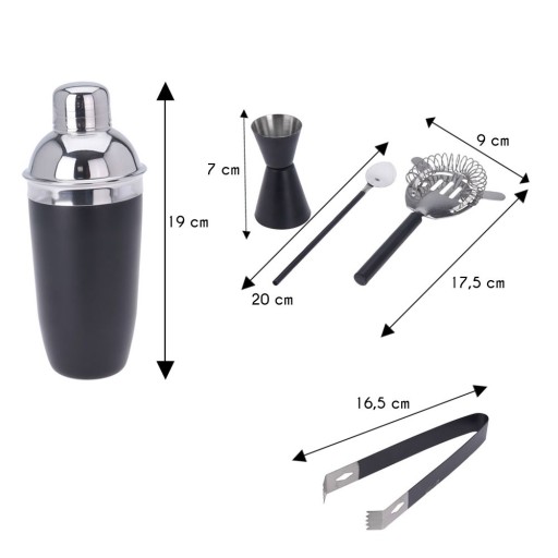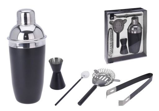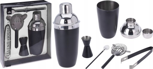 Zestaw barmański do koktajli i drinków. Całość wykonana ze stali nierdzewnej w kolorze czarno-srebrnym. Shaker pozwala w łatwy sposób wymieszać ze sobą składniki. Zestaw będzie świetnym pomysłem na prezent.