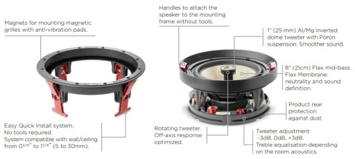 Ten 2-drożny głośnik współosiowy składa się z głośnika niskotonowego 8 "(21 cm) ze stożkiem lnianym oraz głośnika wysokotonowego z odwrócona kopułką wykonaną ze stopu aluminium i magnezu. 8-calowy głośnik niskotonowy wyposażony jest w ekskluzywną technologię Flax firmy Focal, która konkuruje ze słynnymi przetwornikami stosowanymi w liniach Utopia, Sopra i Electra. Sztywne i bardzo lekkie, specjalne stożki wytwarzają dźwięk, który jest naturalny i niezwykle precyzyjny. Głośnik wysokotonowy jest regulowany i można go obracać, dzięki czemu można regulować wysokie tony w zależności od akustyki pomieszczenia.
