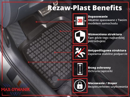 Zestaw stworzony przez firmę MAX-DYWANIK® składający się z dedykowanych dywaników gumowych oraz uniwersalnej osłony na tunel środkowy polskiej firmy REZAW-PLAST.