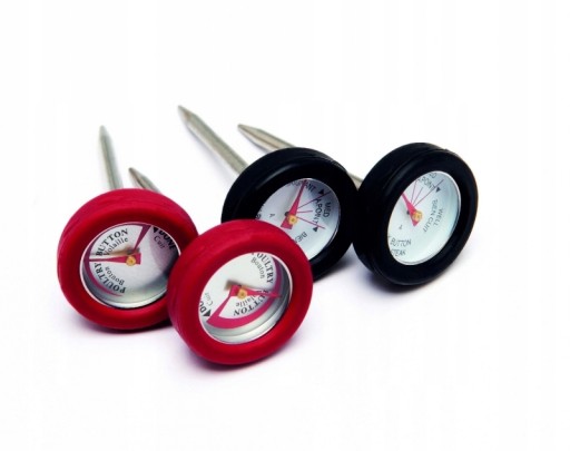 Dwa termometry w kolorze czerwonym wyskalowane do drobiu i dwa wyskalowane do wieprzowiny i wołowiny w czarnym kolorze.