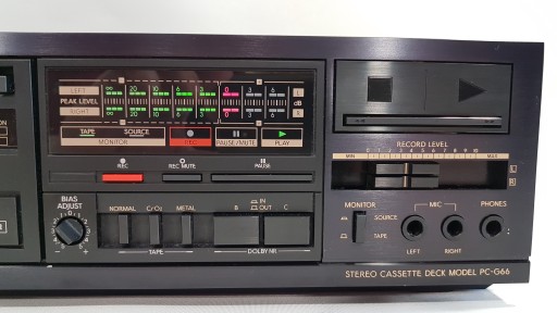Zapraszam do zakupu magnetofonu kasetowego marki TOSHIBA model PC-G66. Nietuzinkowy magnetofon trójgłowicowy w prawdziwym stylu retro. Sprzęt całkowicie sprawny bardzo ładnie nagrywa, odtwarza i przewija. Sprzęt po kompletnym przeglądzie - zostały wymienione paski, ogólna konserwacja jak i został oczyszczony tor przesuwu taśmy jak i cała komora kasety, pełen serwis przełączników i potencjometrów. Super extra bezpiecznie spakowana wysyłka w cenie. Polecam.