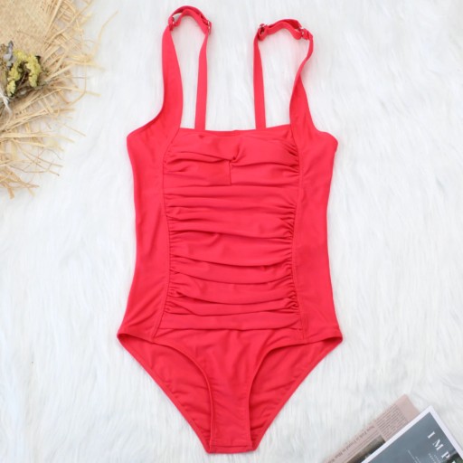 Kostium posiada marszczenia umiejscowione w taki sposób aby optycznie wymodelować sylwetkę.