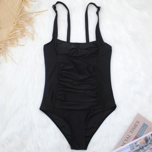 Jednoczęściowy kostium kąpielowy o klasycznym kroju na szerokich ramiączkach zapewniających wygodę noszenia.
