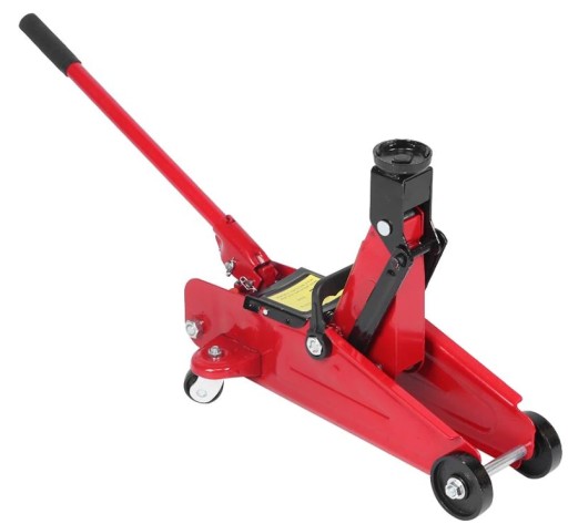 Praktyczny podnośnik samochodowy, wyposażony w koła jezdne, dzięki czemu łatwo się go przemieszcza.