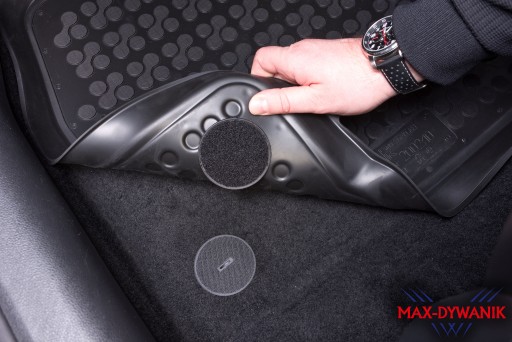 Nasze dywaniki samochodowe dostarczane są zawsze z zestawem mocującym, dopasowanym do danej marki/modelu samochodu (dywaniki posiadają przygotowane miejsce - przetłoczenia w gumie a mocowania dołączone są luzem w woreczku foliowym do zamontowania w wyznaczonych miejscach). Dywanik kierowcy musi zawsze być mocowany do podłogi, podczas gdy możliwość mocowania dywaników pasażerów (z przodu i z tyłu) uzależniona jest od zaprojektowania takiego rozwiązania przez producenta danej marki samochodu.
