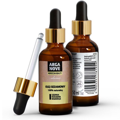 Olej sezamowy marki Arganove nie zawiera sztucznych barwników, konserwantów ani perfum. Ma naturalny sezamowy zapach i żółty kolor. Na aukcji kupujesz 1szt oleju sezamowego 50ml
