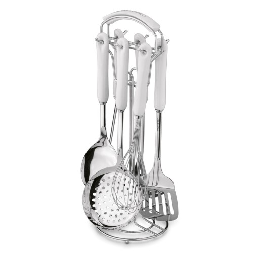 Skład zestawu: - stojak, - łopatka, - szumówka, - ugniatacz do ziemniaków, - nabierka, - rózga kuchenna, - łyżka sałatkowa