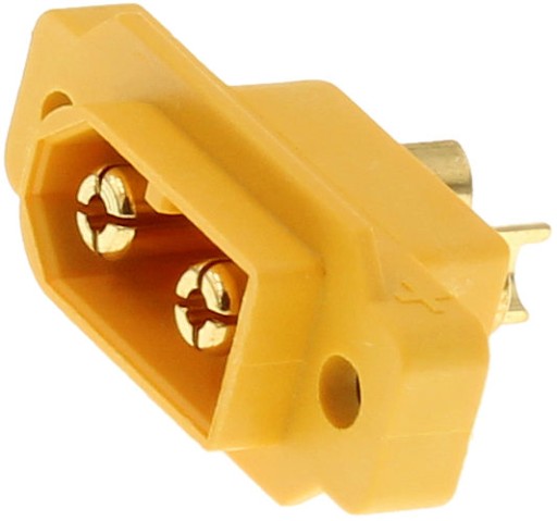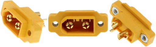 Konektor męski typu XT60E-M firmy Amass. Posiada po bokach otwory z nakrętkami, umożliwiające przykręcenie do panelu lub wspornika. Złącze posiada pozłacane styki, jest wysokoprądowe: 30A (prąd ciągły), 60A (prąd chwilowy). Do tego konektora pasują żeńskie wtyki XT60. Zaleca się przylutować przewody do złącza zapewniające bezpieczne użytkowanie, dedykowany przekrój to 12 AWG lub 14 AWG. Do zamocowania konektora należy użyć śrubek M2,5.