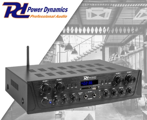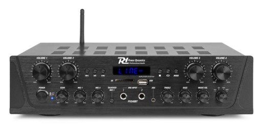 Power Dynamics PV240BT to 4-strefowy wzmacniacz stereo, za pomocą którego głośność 4 stref można regulować oddzielnie. Dzięki PV240BT stworzysz wielostrefowy system stereo dla swojego biura, lokalu gastronomicznego itp.
