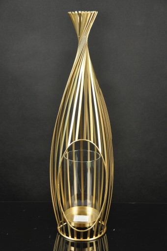 Świecznik metalowy w kolorze złotym, w środku szklana tuba na świecę.