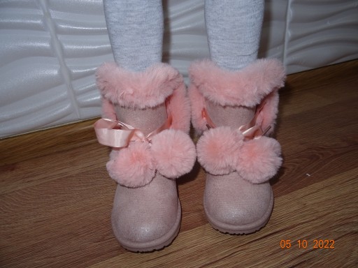Śliczne kozaki dziecięce ocieplone miłym futerkiem z ozdobnymi pomponami.