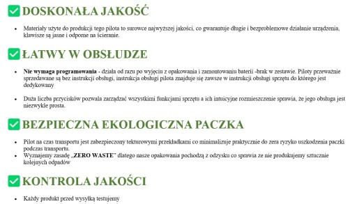 - Materiały użyte do produkcji tego pilota to surowce najwyższej jakości, co gwarantuje długie i bezproblemowe działanie urządzenia, klawisze są jasne i odporne na ścieranie. Piloty przeważnie sprzedawane są bez instrukcji obsługi, instrukcja obsługi pilota znajduje się zawsze w instrukcji obsługi sprzętu do którego jest dedykowany