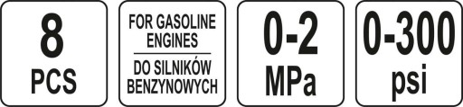 8-częściowy zestaw przeznaczony do pomiaru ciśnienia sprężania w silnikach benzynowych.