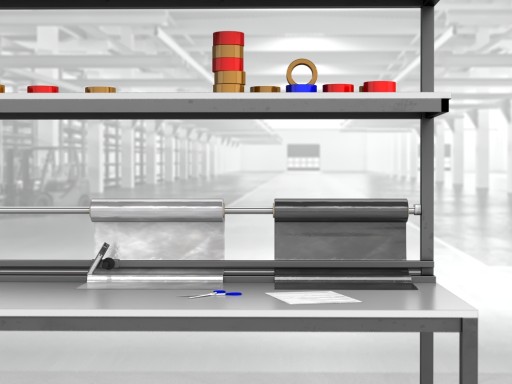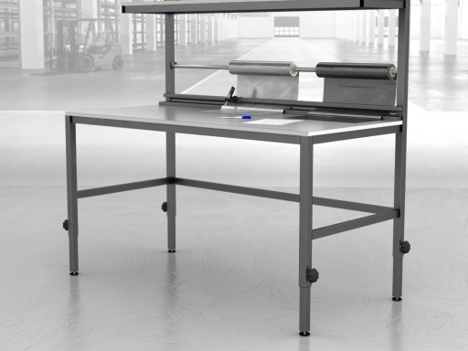 Wysokiej jakości stół warsztatowy do pakowania paczek wykonany z profili metalowych spawanych w stabilną bryłę.