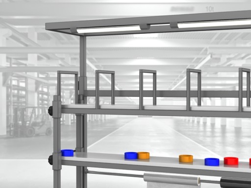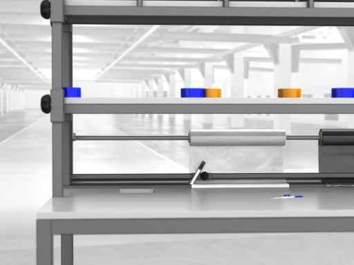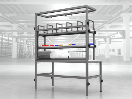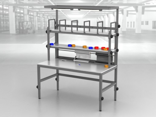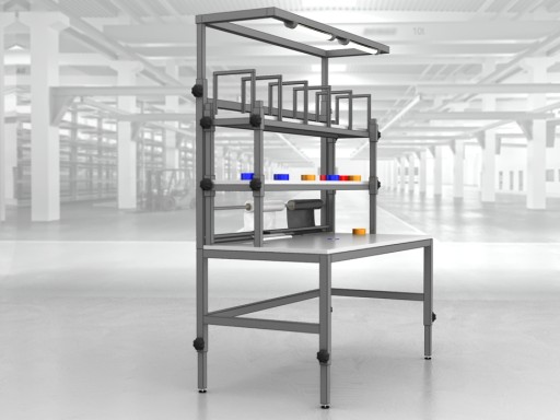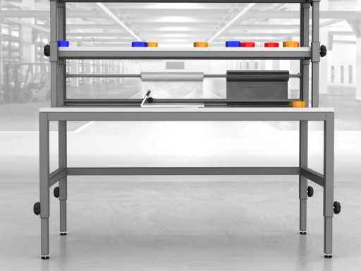 Wysokiej jakości stół warsztatowy do pakowania paczek wykonany z profili metalowych spawanych w stabilną bryłę.