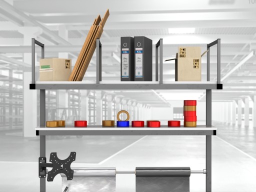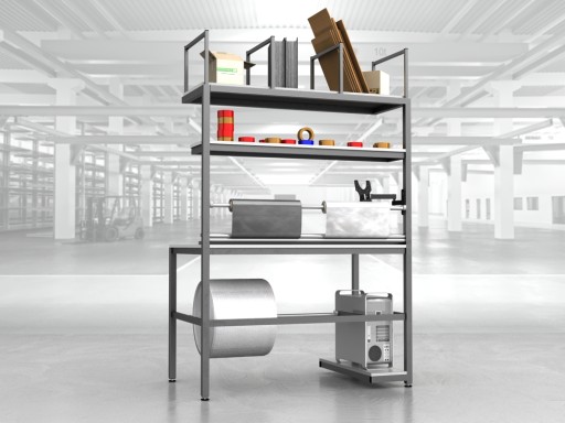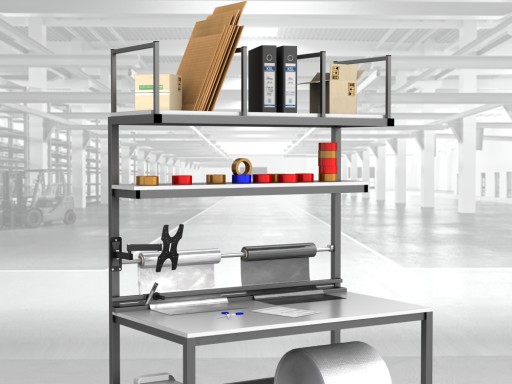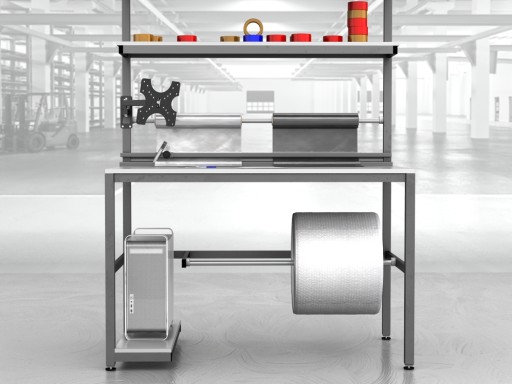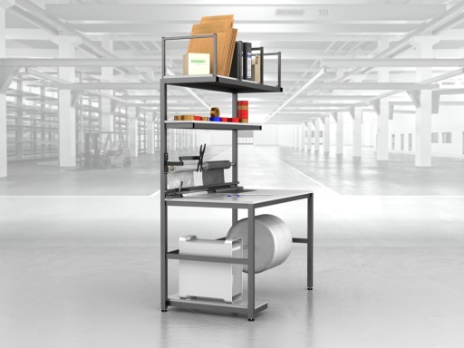 Wysokiej jakości stół warsztatowy do pakowania paczek wykonany z profili metalowych spawanych w stabilną bryłę.