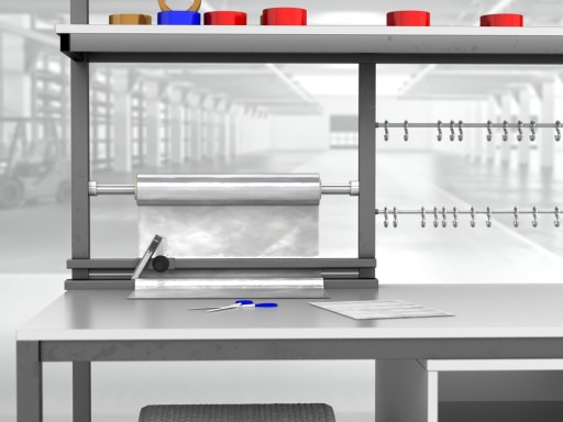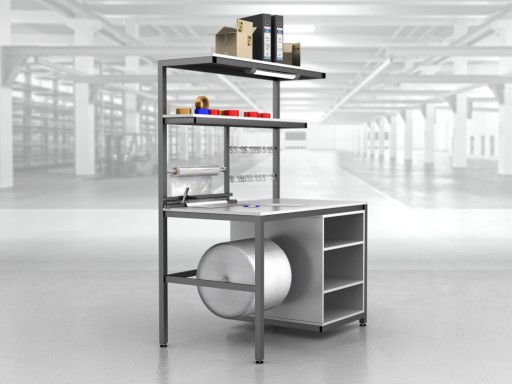 Wysokiej jakości stół warsztatowy do pakowania paczek wykonany z profili metalowych spawanych w stabilną bryłę.
