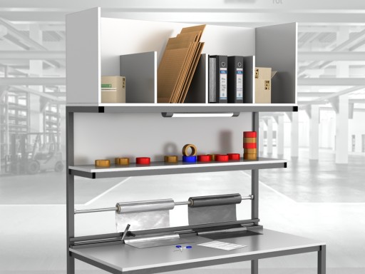 Wysokiej jakości stół warsztatowy do pakowania paczek wykonany z profili metalowych spawanych w stabilną bryłę.