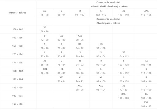 - Obwód klatki piersiowej (zakres): 110-118
