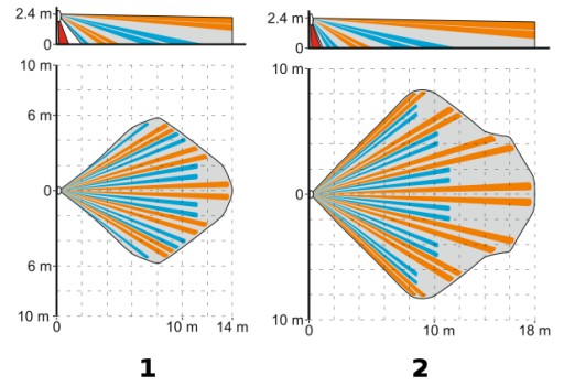 - obszar detekcji: 14 m x 11,5 m, 82° (normalna czułość), 18 m x 16,5 m, 92° (wysoka czułość)
