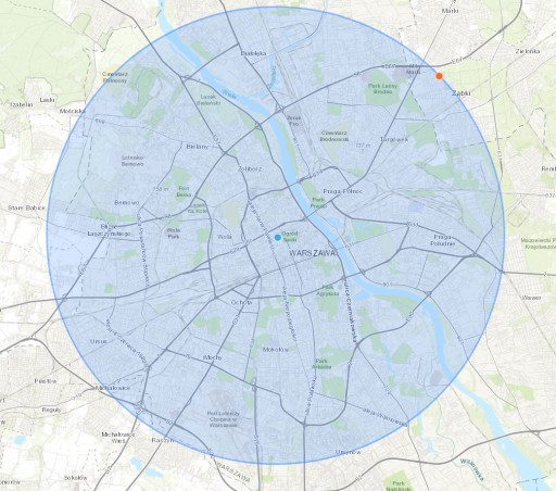 - usługa realizowana jest na obszarze oznaczonym na mapie - jest to obszar o średnicy 10km licząc od ul. Elektoralnej 9,