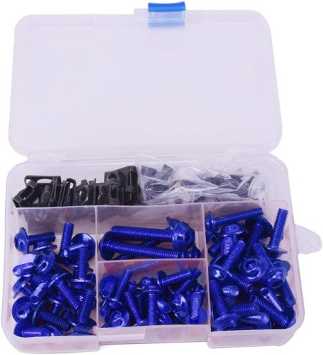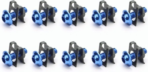 Komplet śrub aluminiowych z podkładkami dystansowymi nylonowymi oraz gumowymi tulejami. Tuleje posiadają metalowy rdzeń. Śruby służą do mocowania owiewek motocyklowych oraz szyb w motocyklu również nadają się do quada skutera motoroweru.