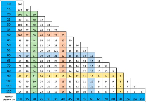Przybliżona ilość podstaw wymaganych na m2 w zależności od wielkości płytek